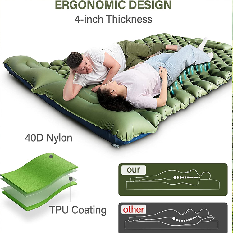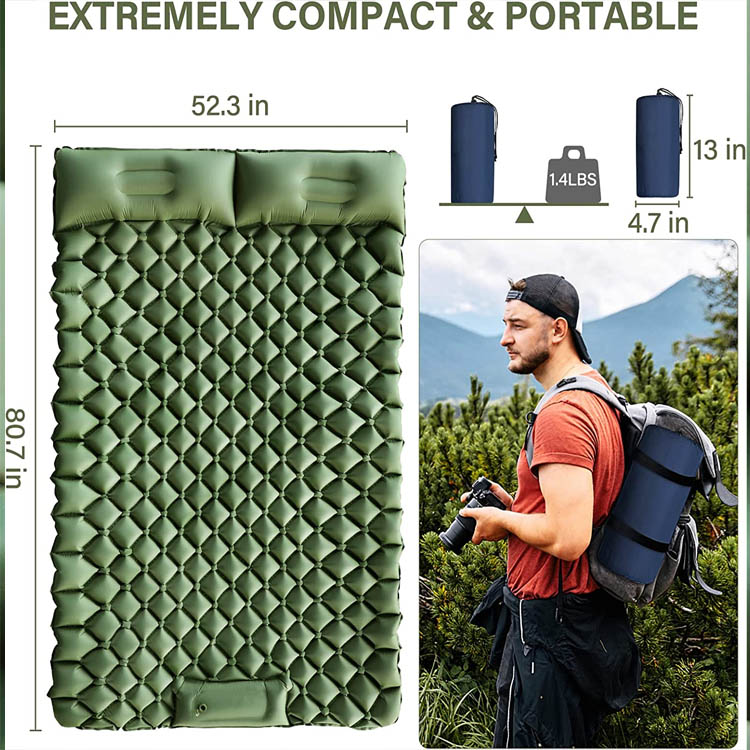 Διπλό Πρόσωπο Camping Sleeping Pad Φουσκωτό Camping Pad.Ultimate Double Comfort για Υπαίθριες Περιπέτειες. Αυτό το φουσκωτό μαξιλαράκι κάμπινγκ για δύο άτομα προσφέρει ευρύχωρο χώρο ύπνου με πρωτοποριακό σχεδιασμό που συγκρατεί τα πόδια για να αποτρέπει την ολίσθηση. Ως εξαιρετικά ελαφριά λύση, προσφέρει απαράμιλλη φορητότητα και κοινή άνεση για ζευγάρια και φίλους στο κάμπινγκ.