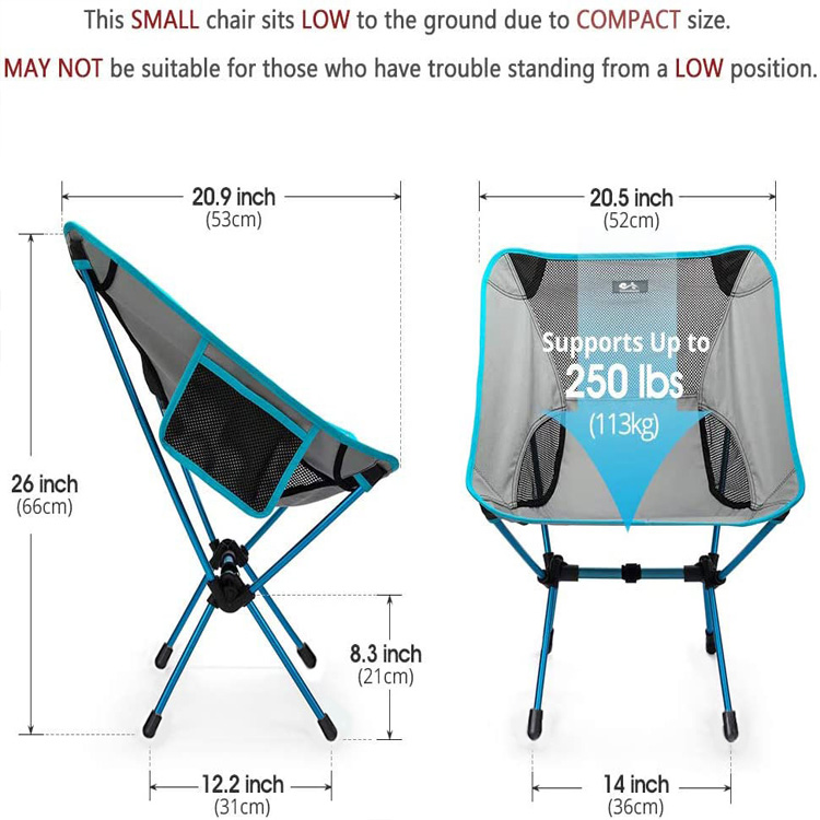 Εξαιρετικά ελαφριά φορητή, συμπαγής πτυσσόμενη καρέκλα κάμπινγκ. Απολαύστε άνεση οπουδήποτε με αυτήν την εξαιρετικά ελαφριά φορητή πτυσσόμενη καρέκλα. Συμπαγές και εύκολο στη μεταφορά με την εύχρηστη τσάντα αποθήκευσης, είναι ιδανικό για εκδρομές στην παραλία, κάμπινγκ, σακίδια πλάτης, πεζοπορία ή οποιαδήποτε υπαίθρια περιπέτεια όπου η άνεση συναντά την άνεση.